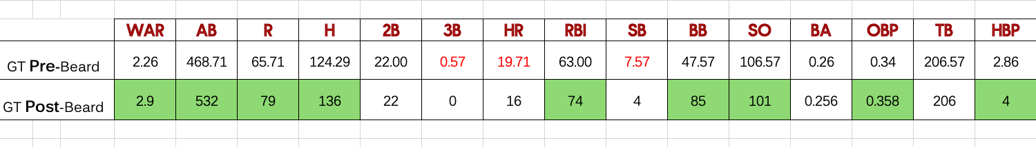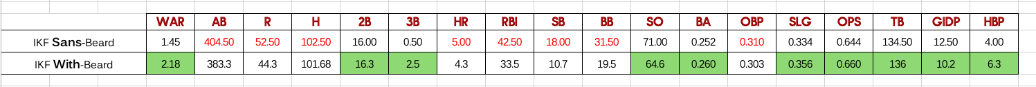 The Green boxes are stats that (on average) he improved upon from his pinstriped/shaven performance. Walks nearly doubled, 10+ more hits and RBI per season, and his WAR (Wins Above Replacement) kicked up to nearly 3. Maybe the most impressive change is that with beard Gleybey-baby cut his K’s by almost 21%!